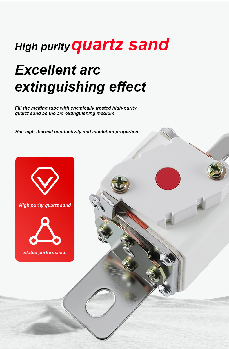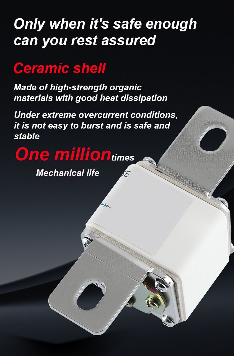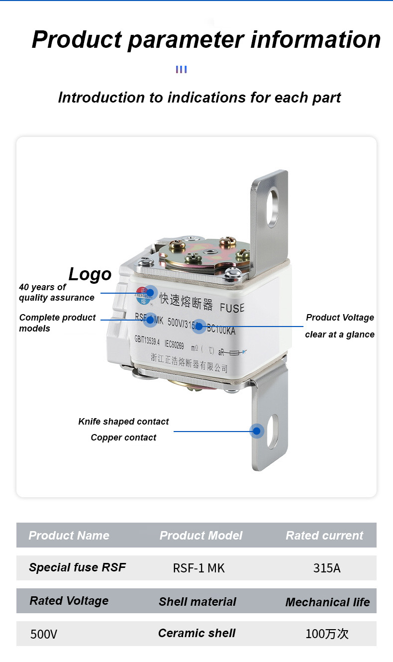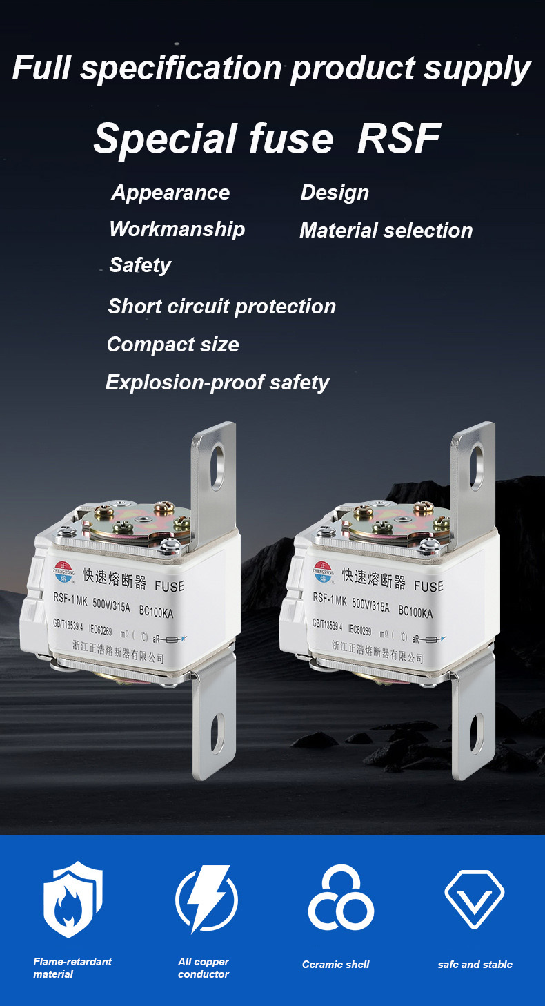 ha una tensione nominale di 500 V e una corrente nominale di 315 A, che può garantire efficacemente la sicurezza elettrica, prevenire sovraccarichi e cortocircuiti. I fusibili RSF-1K 500V-315A BC100KA