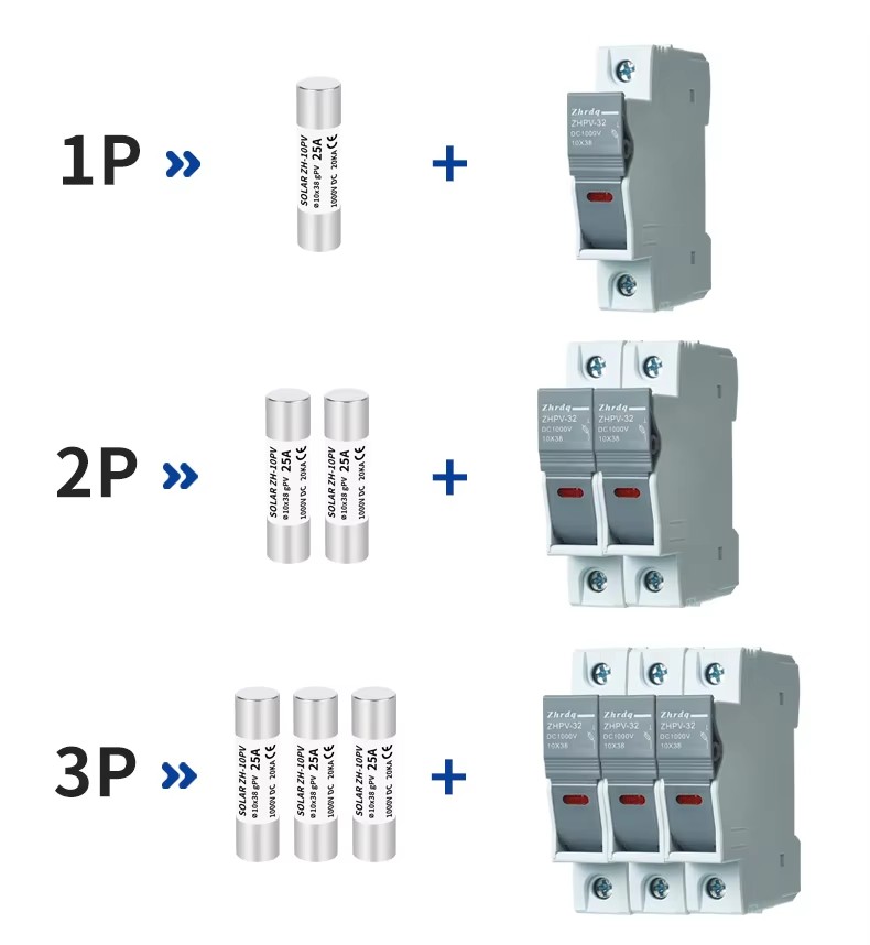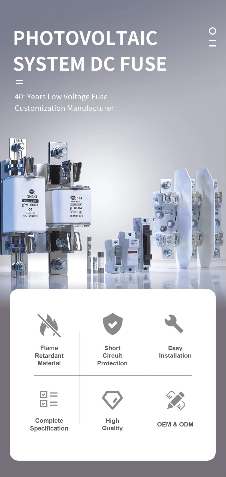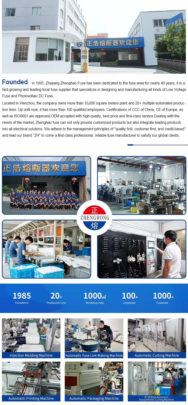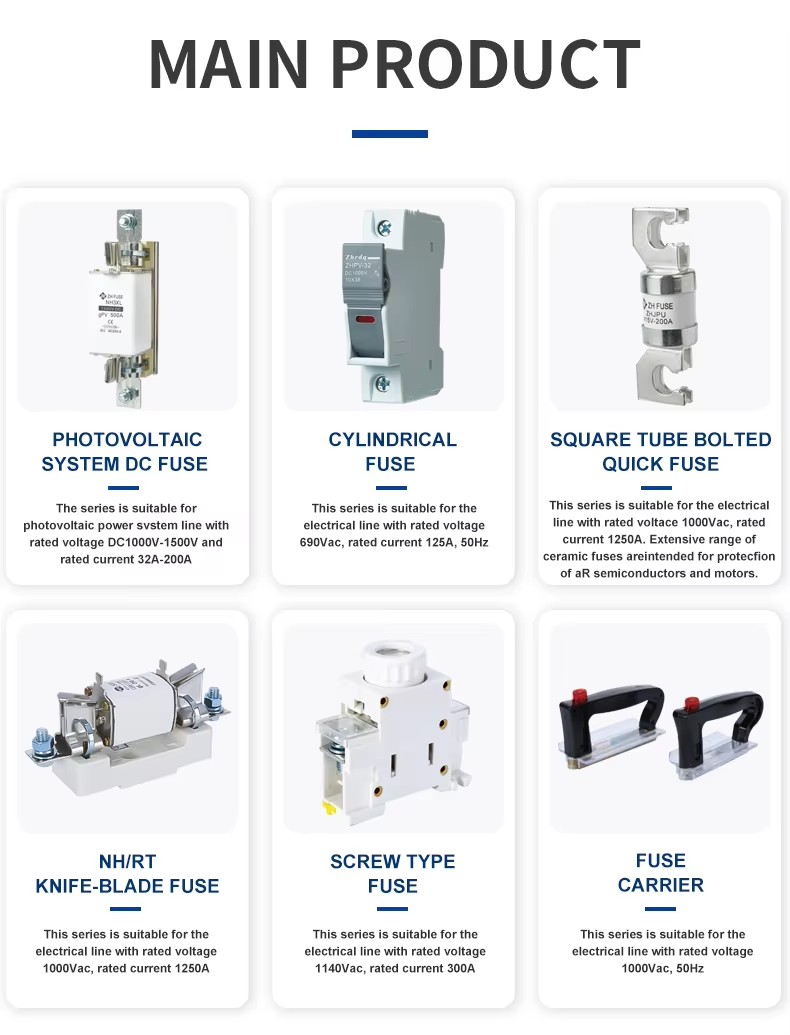 Le caratteristiche strutturali della base del fusibile e dei fusibili DC ZHPV-125 1000 V, i collegamenti a fusibile ceramica cilindrici 22 × 58 mm nel sistema fotovoltaico sono i seguenti. Questa serie di fusibili è costituita da un collegamento a fusibili e un titolare del fusibile. Il corpo a fusibile a sezione trasversale variabile in foglio di rame puro (o filo di rame, filo d'argento, foglio d'argento) è sigillato in un tubo di fusibile fatto di tubo di tessuto in vetro ceramico o epossidico ad alta resistenza, riempito con sabbia al quarzo ad alta purezza trattata chimicamente come mezzo di estinguente. I due lati del nucleo dei fusibili sono collegati in modo affidabile alla piastra terminale attraverso la saldatura a punti, formando una struttura a forma di cappuccio cilindrico. La base del fusibile CC ZHPV-125 1000V è realizzata in resina o guscio di plastica premuto con scosse elettriche, incluso un elemento di fusibili, che è collegato dal rivestimento come supporto per il componente corporeo del fusibile di dimensioni appropriate. Questa serie di fusibili presenta i vantaggi di un piccolo volume, un'installazione facile, un uso sicuro e un bell'aspetto.